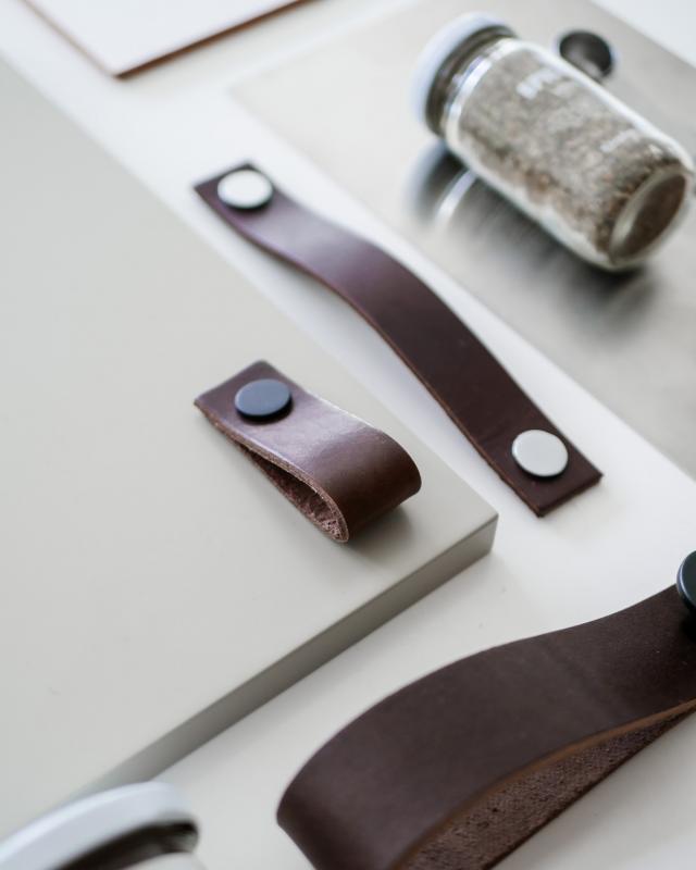 - Mørkebrune lærhåndtak og lærlooper på kjøkkendørene som bare blir finere jo mer du bruker dem. Som en detalj på beslagene kan du velge metall i svart, krom eller nikkel.