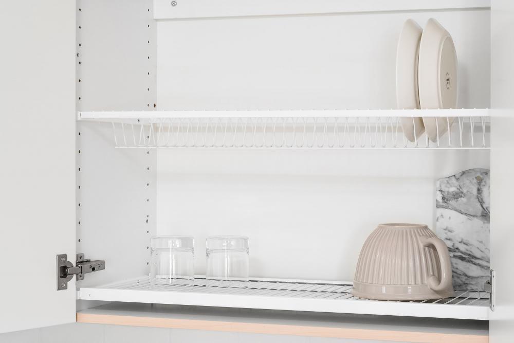 Oppvaskoppbevaring for skap! Et komplett sett med hyller og dryppbrett til å plassere i ditt veggskap.
