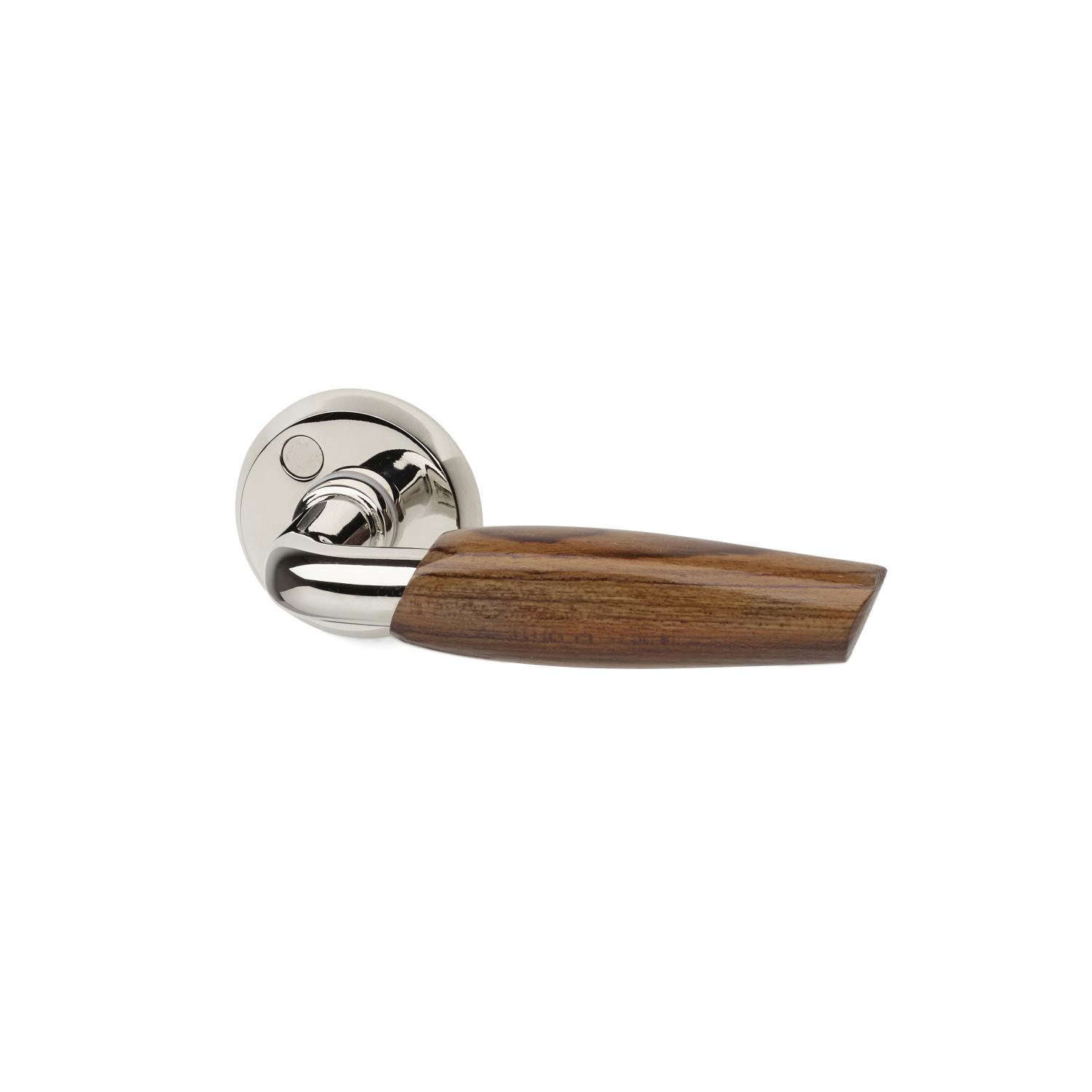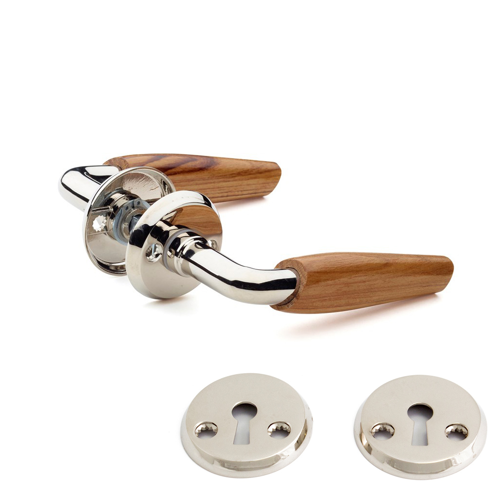 Dette klassiske dørhåndtaket i nikkel med teakgrep er inspirert av midten av 1900-tallet og kombinerer tidløs eleganse med moderne funksjonalitet. Denne designen gir dørene dine en sofistikert og stilfull følelse.