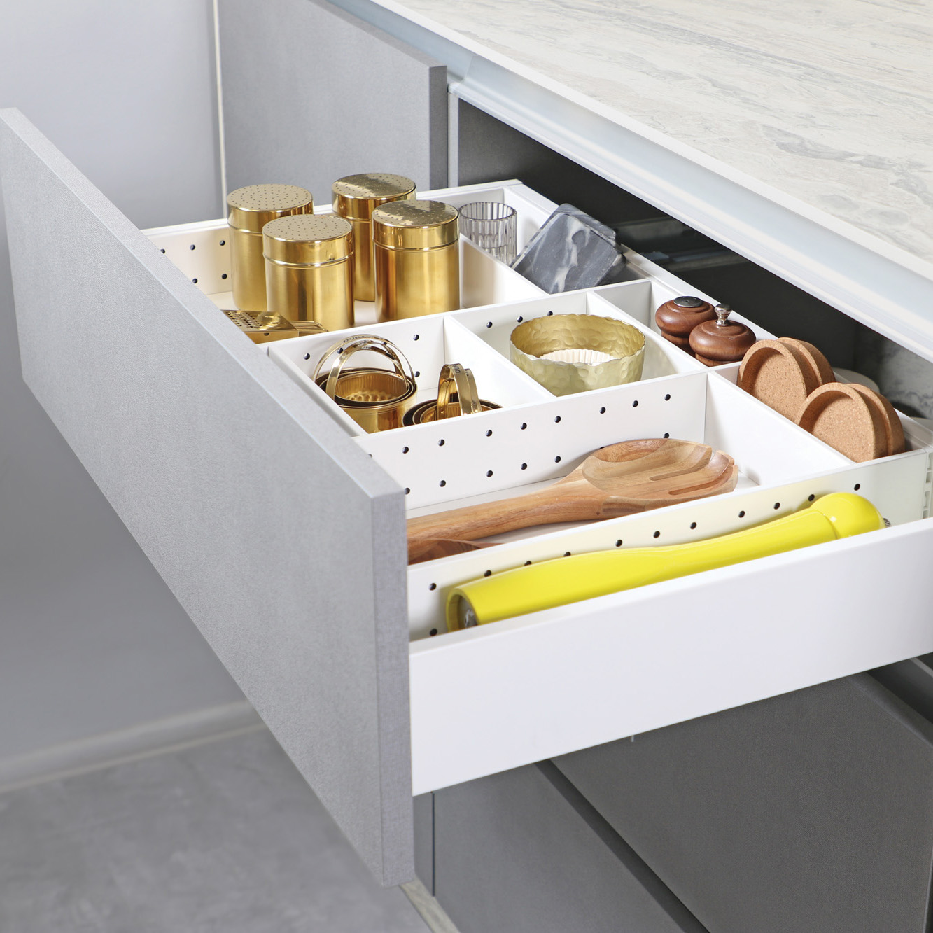 Fleksibelt skuffinnredning i metall til kjøkkenskuffer og skuffer i baderomskommoder. Kombiner deler selv for å lage din unike bestikkinndeling.