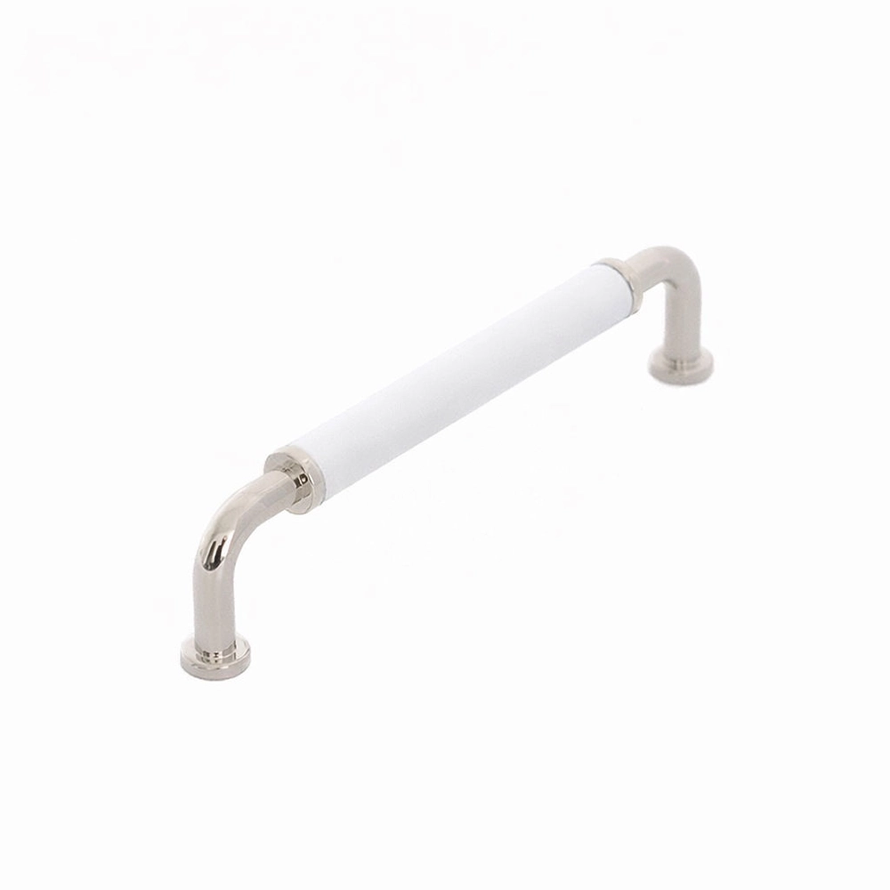 Retrobeslag Lidhult i funkisstil med stilinspirasjon fra 1920-tallet. Håndtaket har en hvit midtdel og føtter i blank nikkel.