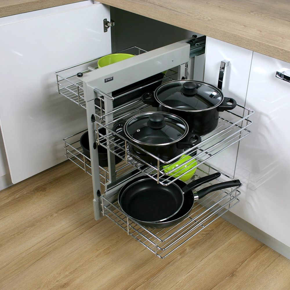 Vår mest romslige hjørneskapsuttrekk er Magic Corner! Et smart uttrekk som følger skapets form, og gir deg maksimal utnyttelse av det ellers vanskelige hjørneskapet på kjøkkenet!