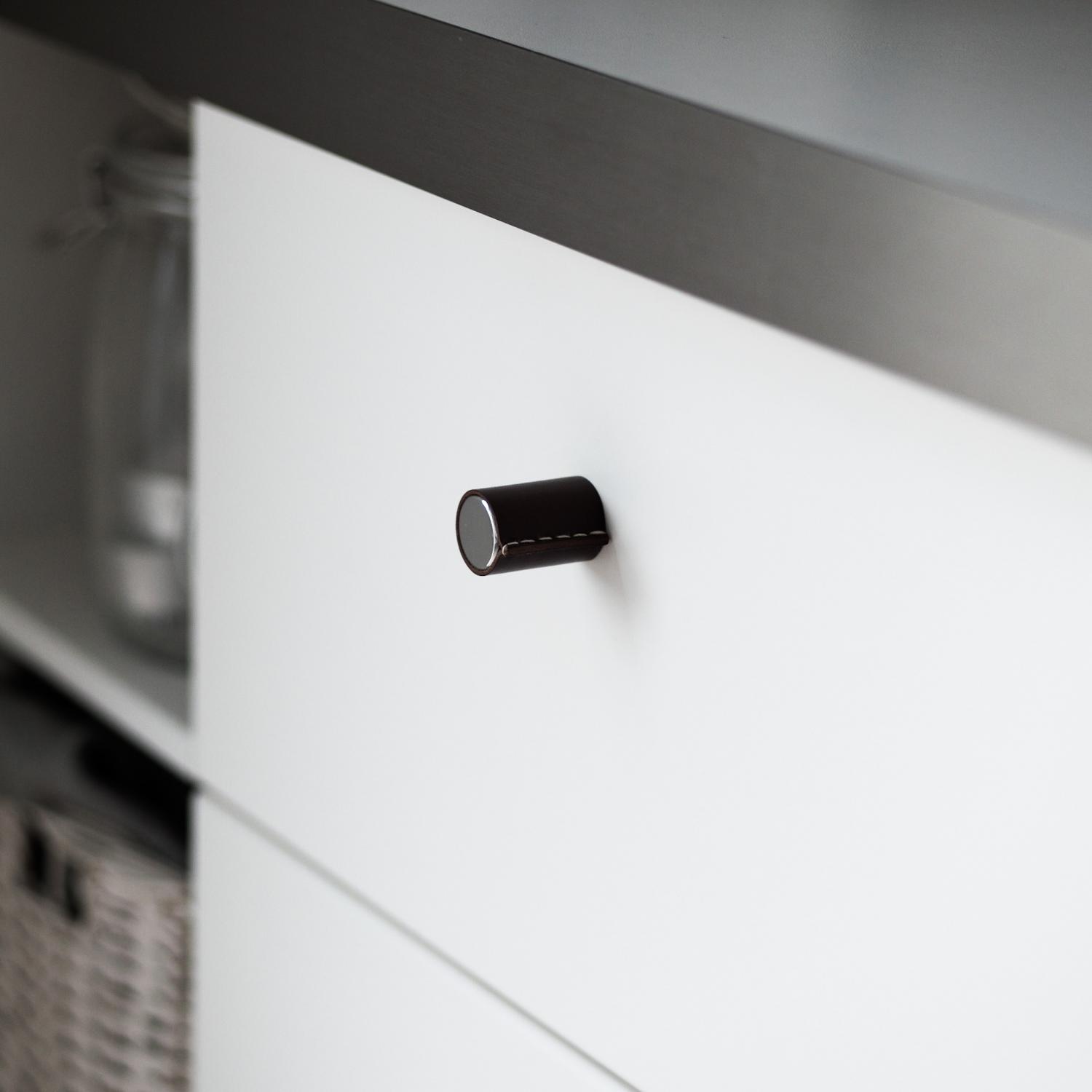Helt unik knott kledd med lær og en dekorativ søm for en solid følelse. Knotten passer både som dekorasjon på en kommode, et nattbord og et garderobeskap, samt på et helt kjøkken.