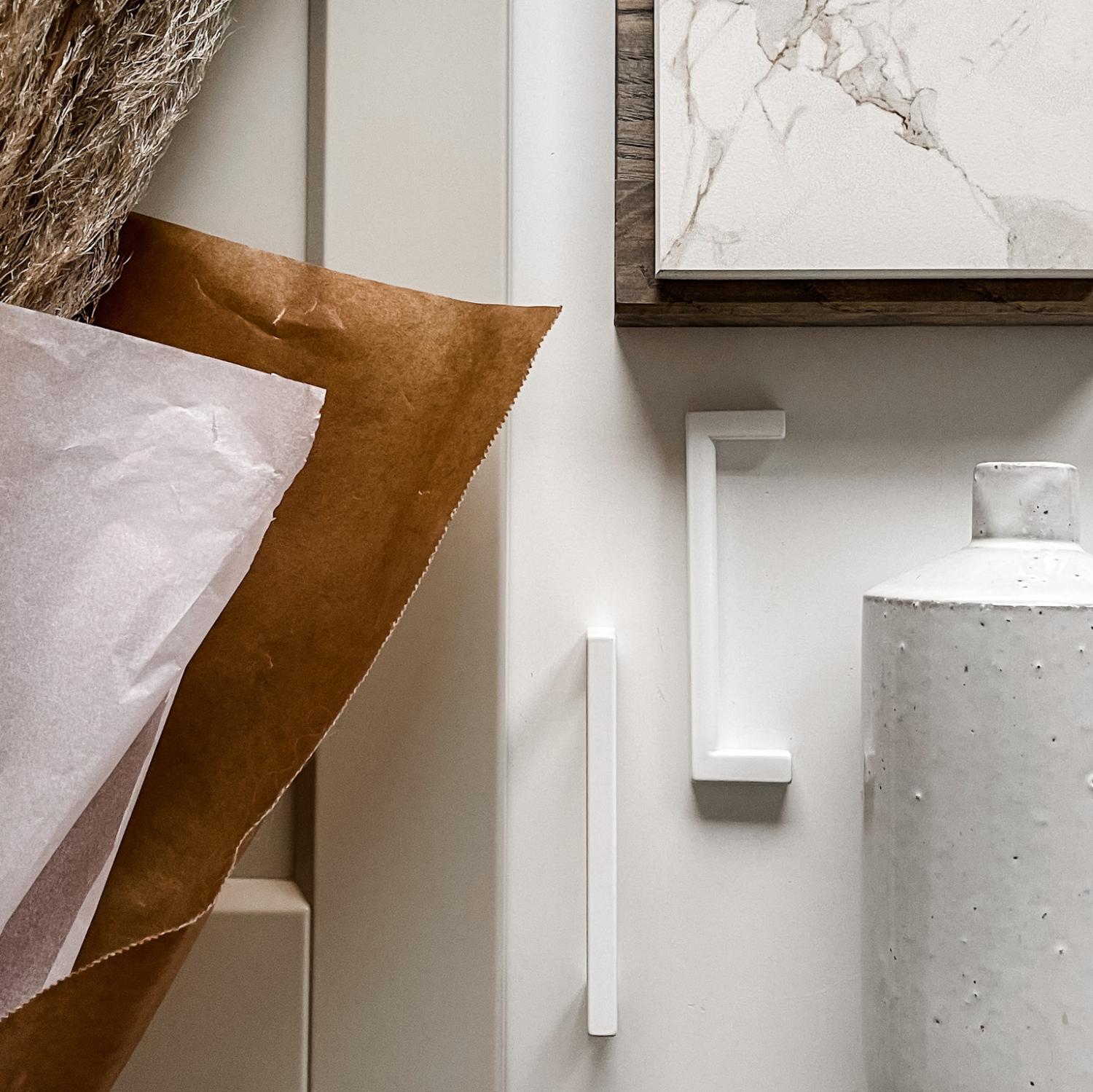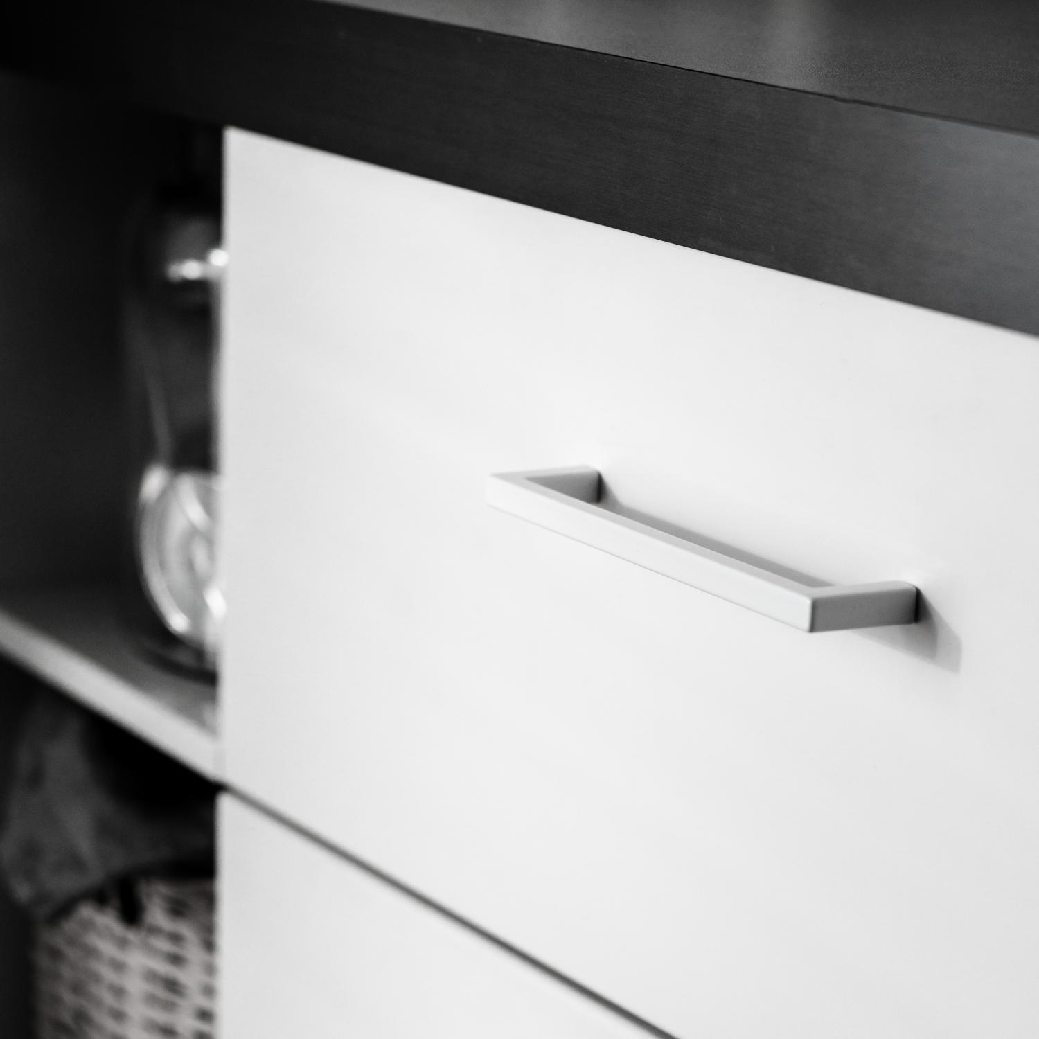 - Beslaget monteres med medfølgende skruer gjennom en skapdør eller skuff.