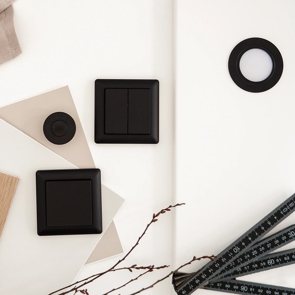 Trådløs 2-veis bryter som drives av kinetisk energi. Våre innovative 2-veis brytere som drives av kinetisk energi tilbyr fremtidens løsning for styring av belysning på kjøkken, bad og rom. Med disse bryterne kan vi kontrollere lamper helt uten kabling eller batteri!