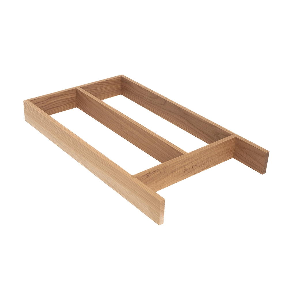Slank redskapsinnsats i tre, laget i eik, som passer perfekt i kjøkkenskuffer og hjelper deg med å holde orden på større kjøkkenredskaper. Den rette designen og de tre romslige rommene gjør den ideell for sleiver, stekespader, tenger og andre kjøkkenredskaper som ellers lett havner hulter til bulter i skuffen.