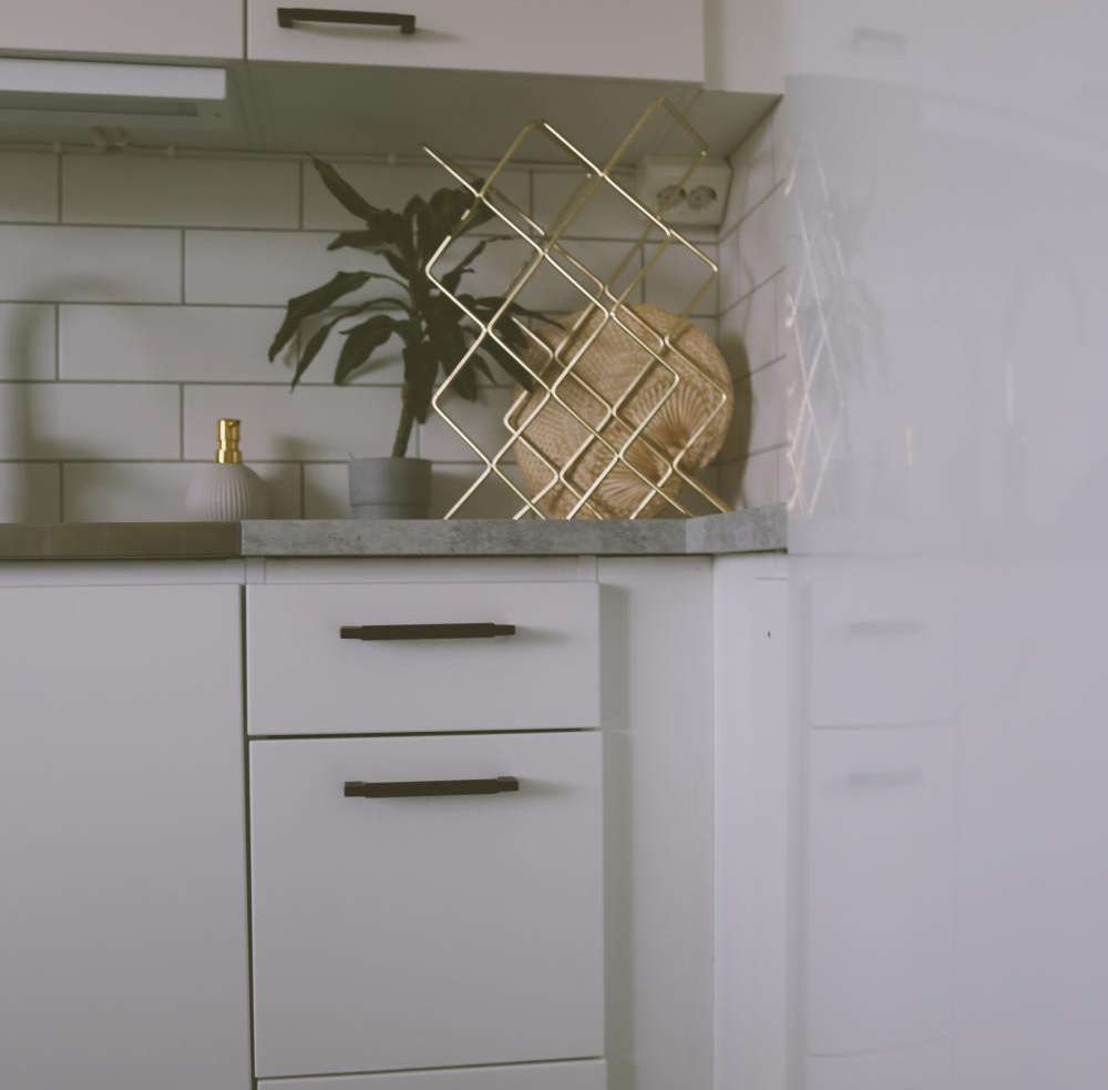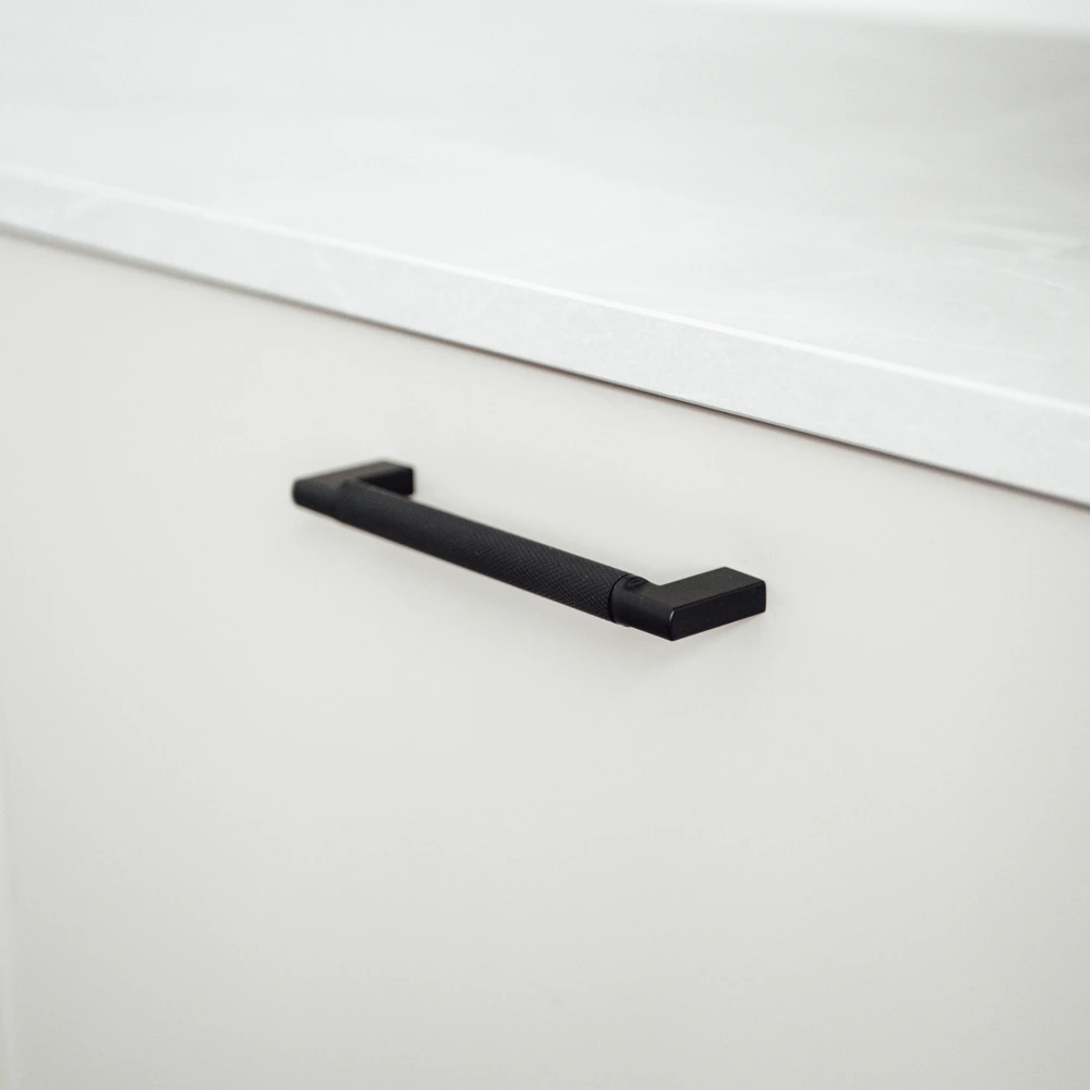 Kjøkkenhåndtak i industriell design med mønster likt diamantkutt.