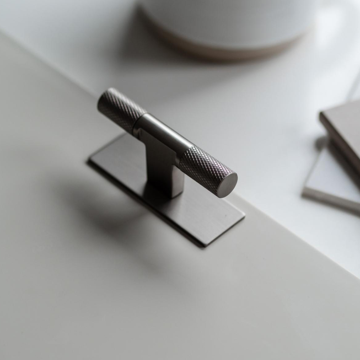 Forkrommet T-Bar-knott i industriell grafisk design. Knotten har et rått design med mønster som minner om diamantsnitt.