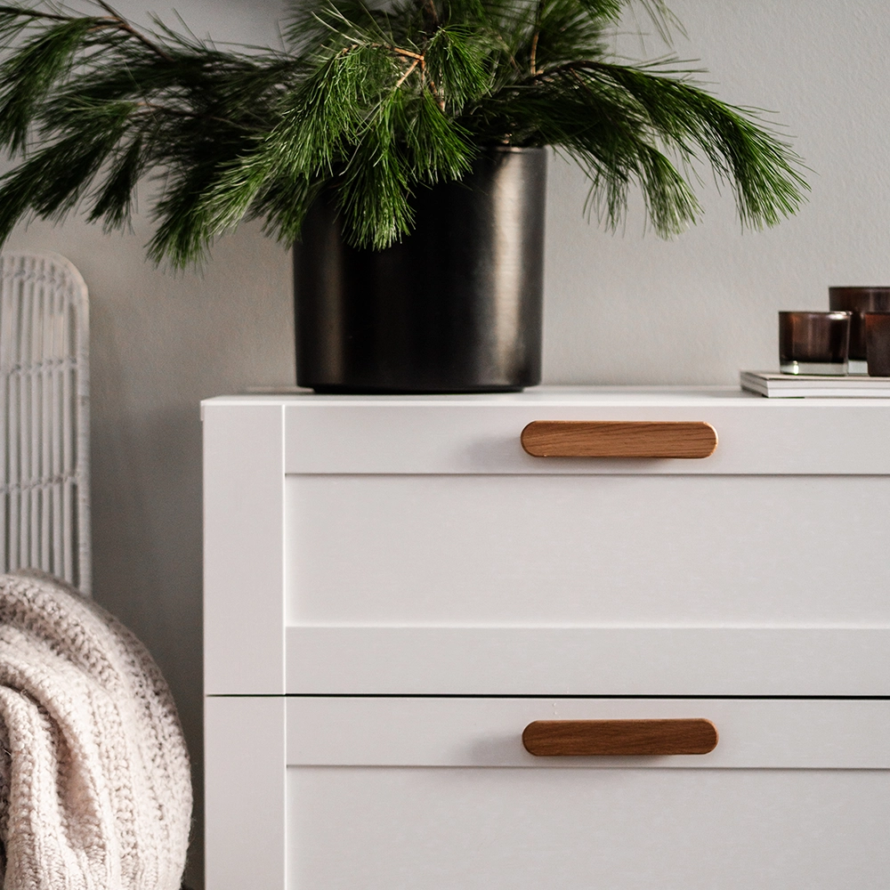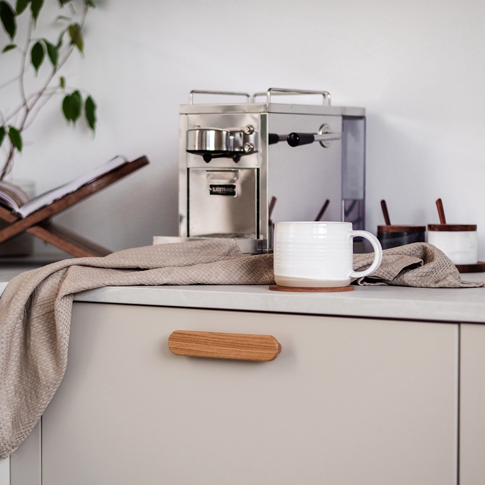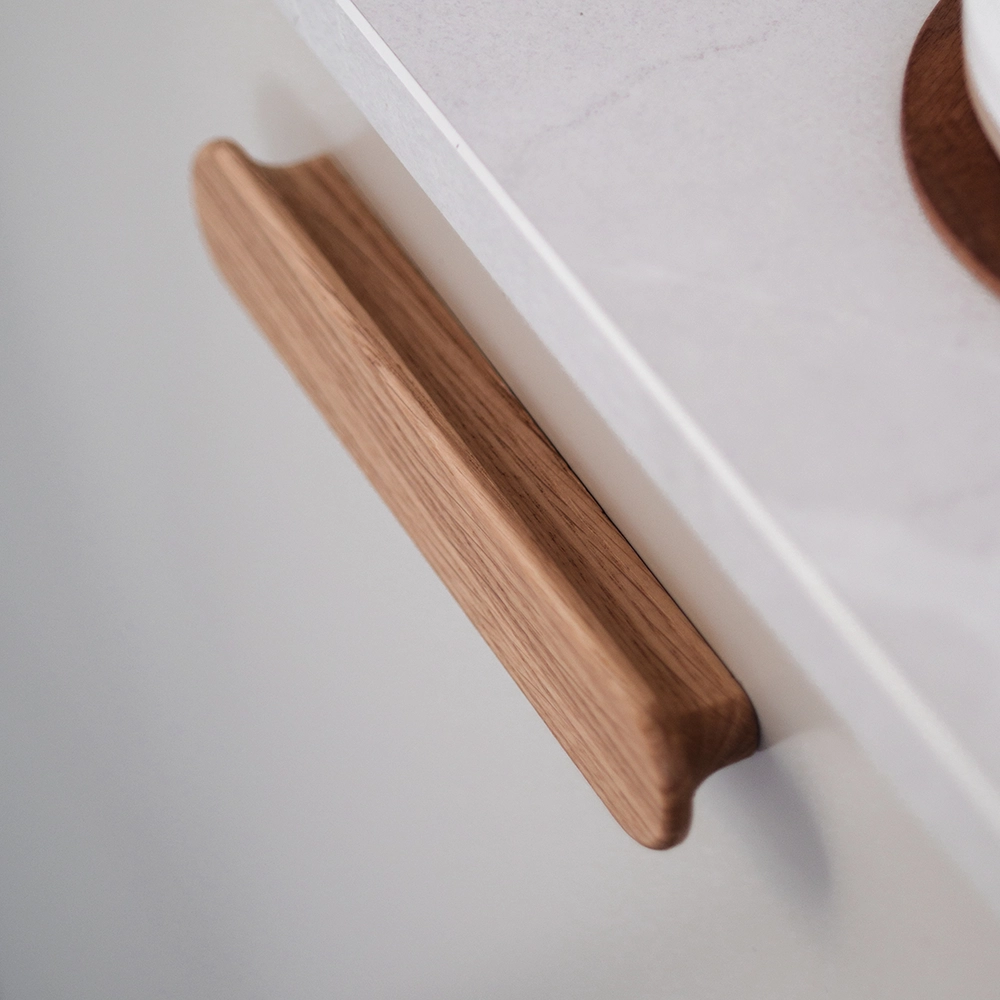 Håndtak Ekeby er et mykt avrundet håndtak i massiv eik som kombinerer naturlig varme med høy funksjonalitet. Den dekkede foten smalner inn mot døren og gir et stilrent og harmonisk uttrykk på kjøkkenet. Eiken er lakkert og 100% FSC-sertifisert, noe som garanterer et bærekraftig og ansvarlig valg for hjemmet ditt.
